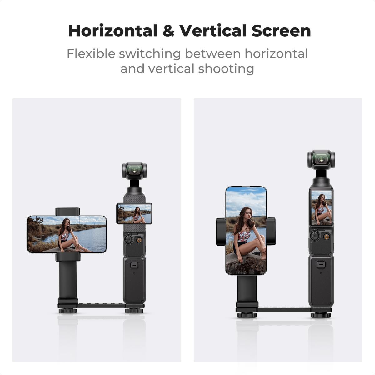 El soporte para teléfono móvil K&F Concept DJI Osmo Pocket 3 es el complemento perfecto para tu Pocket 3, ya que integra a la perfección tu smartphone para ofrecer una imagen ampliada y un control mejorado de la cámara. Está fabricado con una aleación de aluminio de primera calidad y plástico resistente PC+ABS con acero inoxidable, lo que garantiza una conexión estable y segura. Gracias a su giro universal de 360° en horizontal y vertical, su ajuste de inclinación de 180° y varias opciones de fijación, incluyendo una rosca de 1/4" y un soporte de montaje en frío, es ideal para trípodes, luces, micrófonos y otros dispositivos.