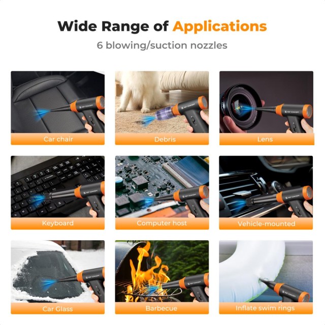 El kit de soplador de aire está diseñado para un uso versátil e incluye varias boquillas y cepillos, además de paños de limpieza, por lo que es ideal para limpiar ordenadores portátiles, interiores de coches, asientos y superficies del hogar. Además de su uso en interiores, también es ideal para actividades al aire libre, como apagar fogatas, inflar flotadores, secar el pelo o el pelaje de las mascotas y quitar la nieve o las hojas de los vehículos.