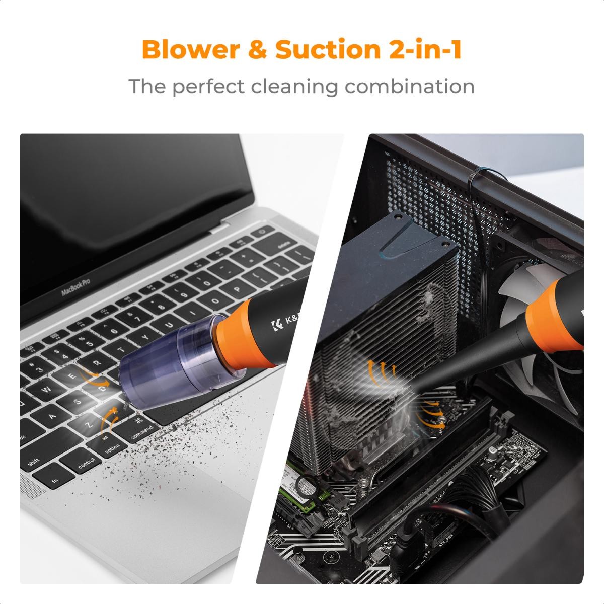 El kit de limpieza eléctrico K&F CONCEPT es un purificador de aire reutilizable de alto rendimiento, diseñado para una limpieza eficaz y ecológica en una amplia gama de aplicaciones. Está equipado con un motor sin escobillas de alta velocidad que alcanza hasta 150 000 revoluciones por minuto y genera un potente chorro de aire con una velocidad de hasta 54 m/s y una fuerza de 180 G, lo que permite eliminar rápidamente el polvo y la suciedad de lugares de difícil acceso. Es capaz de eliminar hasta el 99 % del polvo en tan solo un minuto, lo que lo hace ideal para ordenadores, teclados, cámaras y otros dispositivos de precisión.