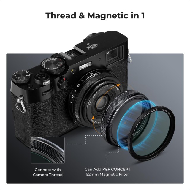 • * 【Magnético】La fijación del marco delantero del filtro es magnética y se puede combinar con los filtros magnéticos K&F CONCEPT de 52 mm, lo que permite escenarios más versátiles y no afecta al uso de la tapa original del objetivo.