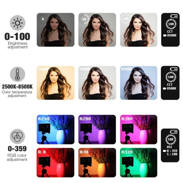 * [Tono, saturación, brillo, temperatura de color ajustable] El tono se puede ajustar en un rango de 0 a 359 grados; la saturación del color se puede ajustar en un rango de 0 a 100 %; el brillo se puede ajustar en un rango de 0 a 100 %; la temperatura de color es regulable desde 2500 K (color cálido) hasta 8500 K (color frío); la pantalla LCD integrada proporciona datos precisos, lo que le permite trabajar de forma más eficiente