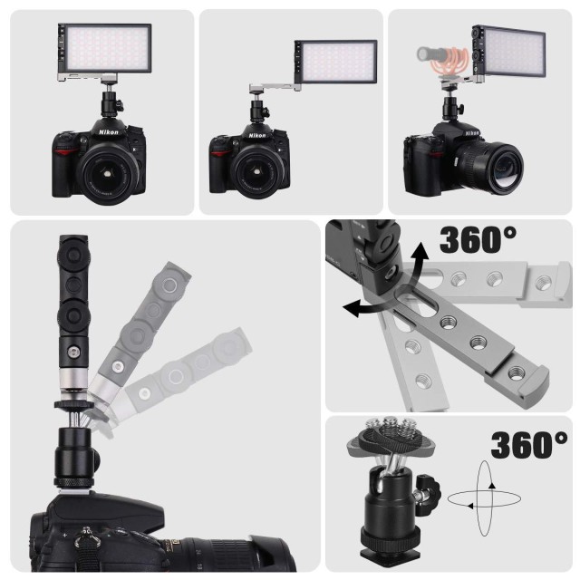 * [Brazo giratorio con zapata fría] Nuestra luz LED de panel está equipada con un brazo giratorio de 360 grados con zapata fría, lo que permite instalar simultáneamente cualquier dispositivo con adaptador para zapata fría, como un micrófono de cámara, lo cual es muy adecuado para la grabación.