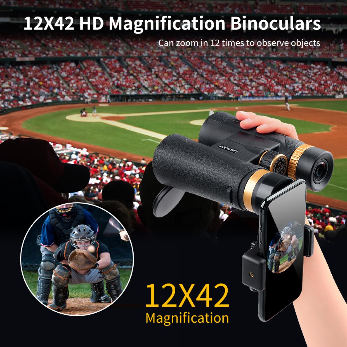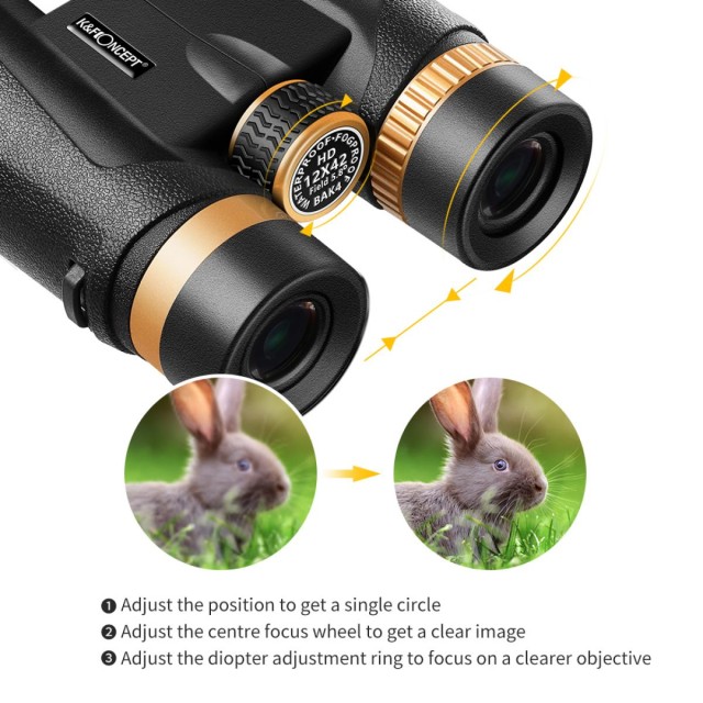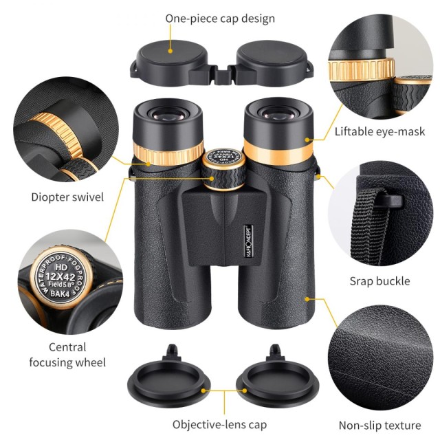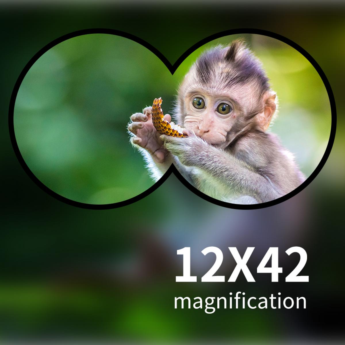 Enfoque con gran aumento 12×42: aumento de 12×42 con alta resolución, buena combinación del sistema óptico y el rendimiento básico, imagen nítida, visión clara. El ocular ampliado de 20 mm proporciona un ángulo de visión amplio y grande con suficiente entrada de luz. La lente cuenta con un tratamiento multicapa que evita el efecto de mareo, garantiza una imagen nítida y clara y aumenta la comodidad de observación. Lente con un gran diámetro de apertura de 42 mm, campo de visión más amplio que permite ver con mayor claridad y nitidez paisajes y animales lejanos, captando la imagen más nítida, clara y estable durante la observación de aves; aumento ideal, campo de visión de 101/1000 m.