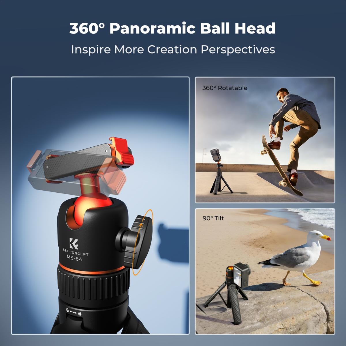 El diseño con rótula permite un giro de 360° y una inclinación de 90°, lo que garantiza un ajuste libre del ángulo y la posibilidad de grabar en vertical. La rosca de 1/4" integrada en la rótula permite acoplar un micrófono o una luz de iluminación para obtener vídeos de mayor calidad.