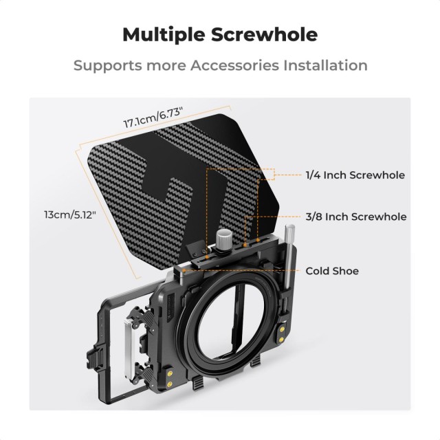• Caja mate de fibra de carbono: acabado mate ligero con diseño ampliado; bloquea la luz difusa, 34 mm de grosor para una vineta nula en objetivos de 16 mm o más.