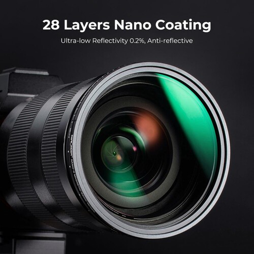 Para garantizar la resistencia y el rendimiento, ambos lados del cristal óptico están recubiertos con 28 capas de nanorrevestimiento. Este proporciona una excelente resistencia al agua, a los arañazos, al aceite y a los reflejos, al tiempo que protege su objetivo y mantiene una alta nitidez de imagen.