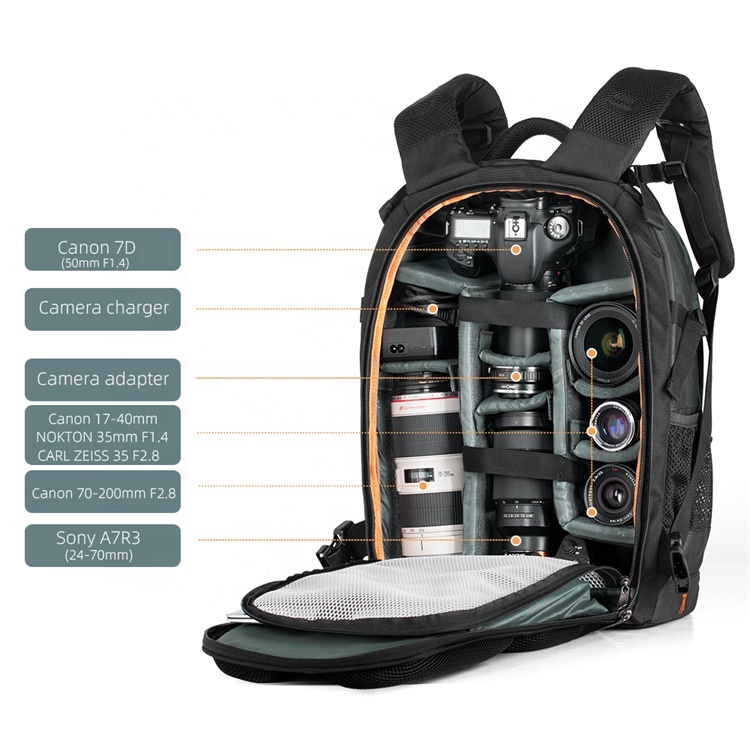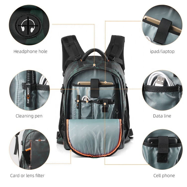 Esta mochila K&F, con un amplio compartimento principal, tiene capacidad para una cámara réflex digital con el objetivo montado, mientras que su sistema modular de compartimentos separa, organiza y protege los objetivos, los flashes, los trípodes y otros accesorios según tus necesidades.