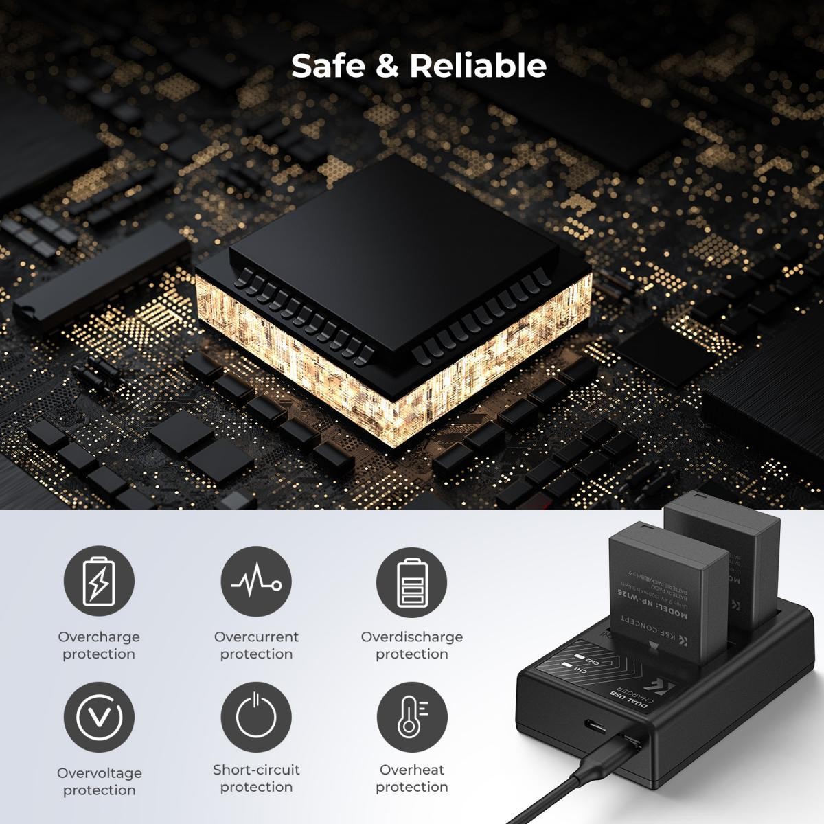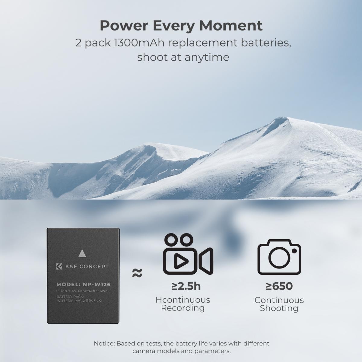 El pack de dos baterías K&F CONCEPT NP-W126 incluye dos baterías de repuesto de alta capacidad (1300 mAh) y un cargador de dos ranuras, que proporciona un rendimiento fiable y duradero para las cámaras Fujifilm compatibles. Gracias a la compatibilidad con la carga a través de Micro-USB y USB-C, y a las protecciones de seguridad integradas, este kit es ideal para fotógrafos que necesitan una fuente de energía flexible y fiable cuando están de viaje.
