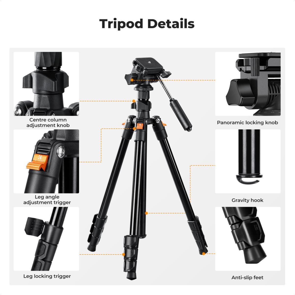 • * 【Columna central de dos niveles】La altura máxima del trípode con la columna central es de 196 cm; sin la columna central, la altura máxima es de 133 cm. El ángulo de las patas se puede ajustar en tres posiciones para adaptarse a las necesidades de diferentes situaciones.