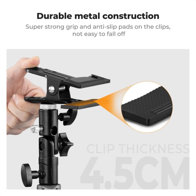 El soporte para reflector K&F CONCEPT Heavy-Duty Photography Reflector Bracket está equipado con una pinza metálica resistente, un revestimiento antideslizante y una base universal de 5/8", lo que permite a los fotógrafos fijar de forma segura los reflectores o los paraguas sin necesidad de un asistente, garantizando así un control estable y cómodo de la iluminación.