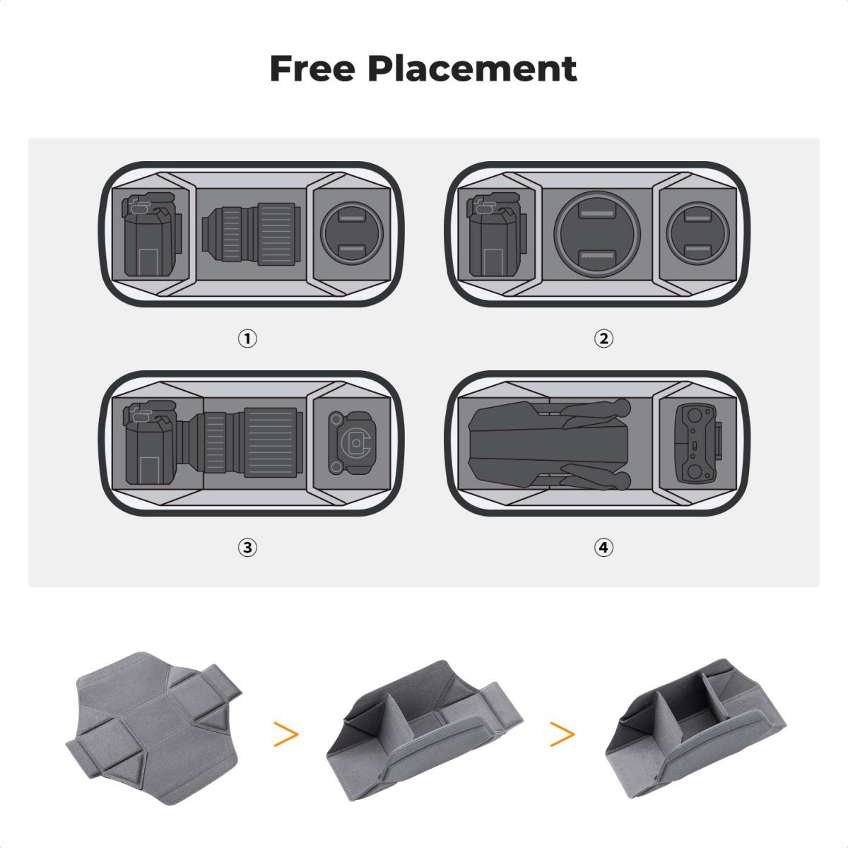 Compartimentos bien organizados: Tres capas separan las cámaras, los objetivos, los accesorios y los objetos personales para un almacenamiento ordenado y limpio, y una búsqueda rápida sin necesidad de rebuscar.