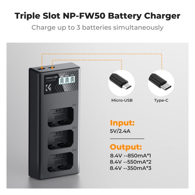 Recarga sin esfuerzo las baterías Sony NP-FW50 con el cargador K&F Concept 3-Pack para cámaras. Este cargador triple, con pantalla LCD inteligente y opciones de carga universales a través de USB o Type-C, garantiza que tus baterías estén siempre listas para la acción.