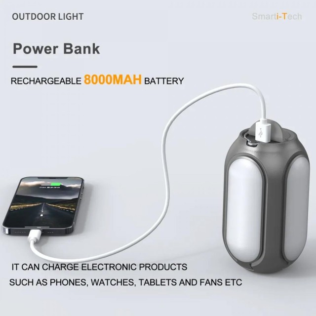 * Se puede utilizar como fuente de energía portátil: esta linterna de camping cuenta con una batería integrada de alta capacidad de 8000 mAh y un puerto de salida USB de 5 V y 2 A para cargar rápidamente el móvil, el iPhone, la tableta y otros dispositivos mediante un cable USB durante las excursiones o la acampada.