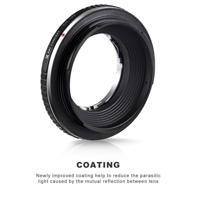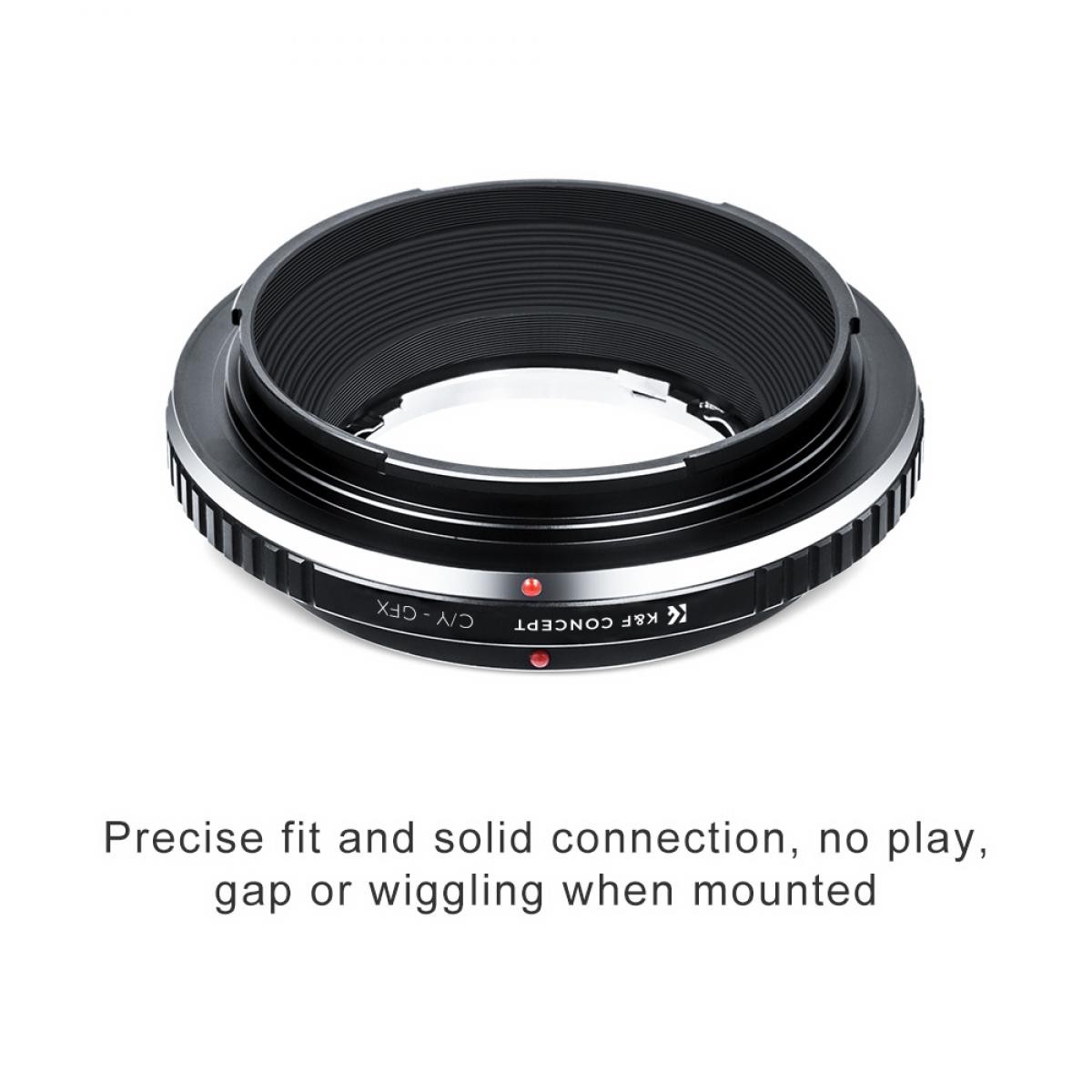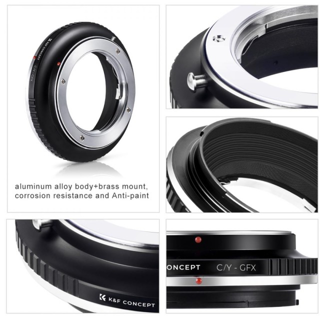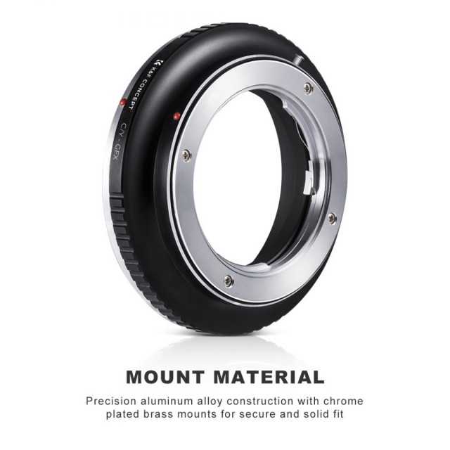 El adaptador de objetivo K&F Contax/Yashica a Fuji GFX permite utilizar objetivos con montura C/Y en las cámaras de formato medio Fujifilm G-Mount GFX. Gracias a su precisa construcción totalmente metálica con fijaciones de latón cromado, garantiza un manejo manual estable y un enfoque continuo.