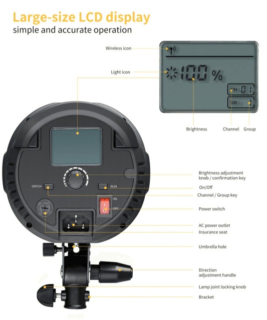 Con un CRI de 95 y un TLCI de 95+, el ST-150W garantiza tonos de piel naturales y una reproducción precisa del color. El brillo se puede ajustar de forma continua entre el 10 % y el 100 % mediante el controlador trasero o el mando a distancia inalámbrico incluido. La pantalla LCD grande y clara muestra el porcentaje de brillo, el canal y la configuración de grupo, lo que permite agrupar y controlar varias luces a la vez.