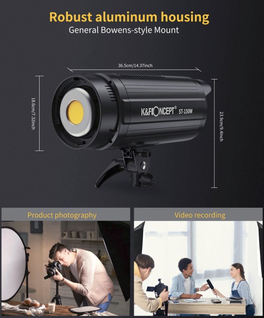 La luz está fabricada con una carcasa de aluminio resistente y está equipada con un eficaz sistema de disipación del calor con un radiador de alta calidad y un ventilador de refrigeración ultrasilencioso, lo que garantiza una estabilidad a largo plazo sin interferir en la grabación de audio. El popular soporte Bowens garantiza una amplia compatibilidad con softboxes y modificadores, mientras que el reflector incluido y la ranura para paraguas permiten modelar la luz de forma flexible. Gracias a su construcción robusta, la posibilidad de control remoto y el soporte universal para trípode, el K&F ST-150W es un instrumento de iluminación fiable para su uso tanto en estudio como en exteriores.
