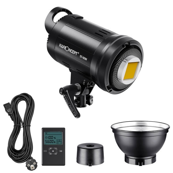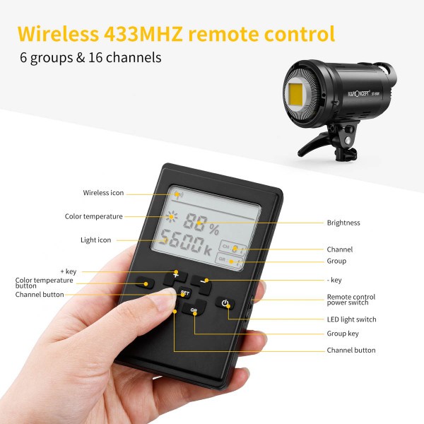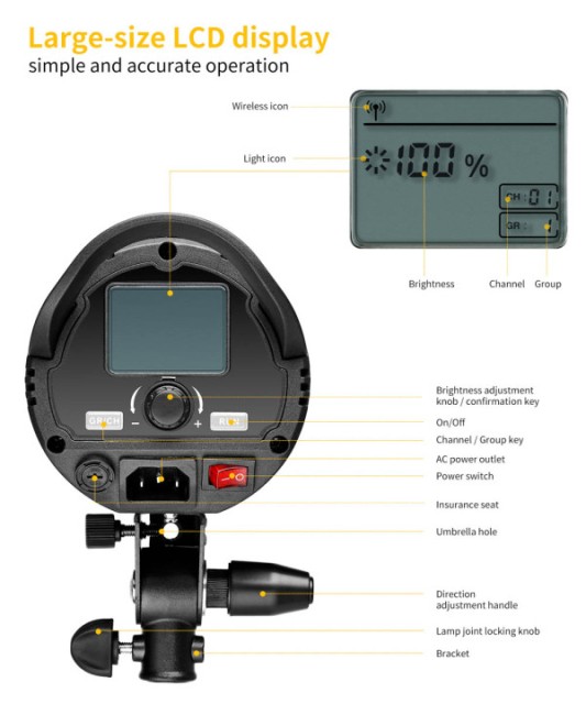 El brillo se puede ajustar de forma continua entre el 10 % y el 100 % mediante el regulador integrado o el mando a distancia inalámbrico incluido. La clara pantalla LCD trasera muestra el porcentaje de brillo, el canal y la información del grupo, lo que permite agrupar y controlar varias luces a la vez. El diseño con montura Bowens es compatible con una amplia gama de softboxes y modificadores, mientras que el reflector incluido y la ranura para paraguas ofrecen opciones flexibles de modelado de la luz.
