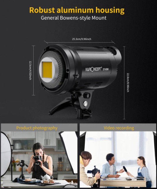 La K&F ST-60W Continuous LED Steady Light es una lámpara LED COB compacta y ligera, diseñada para entrevistas, vlogs y fotografía. Ofrece una reproducción precisa del color, compatibilidad con soportes Bowens y control remoto inalámbrico, y proporciona una iluminación profesional en un diseño muy portátil.