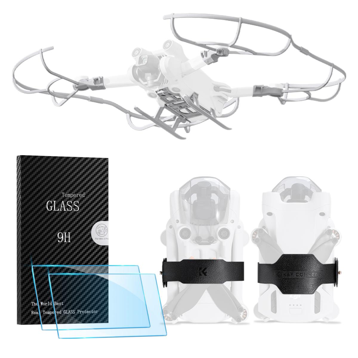 Lámina protectora para el control remoto con pantalla del DJI Mini 3 PRO (paquete de 2 unidades) + tren de aterrizaje elevado + anillo protector contra impactos de las hélices + juego de hélices, kit 4 en 1