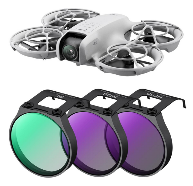 El juego de filtros K&F DJI NEO de 3 unidades incluye filtros CPL, ND8 y ND16 diseñados para drones DJI. Estos filtros están fabricados con cristal óptico de alta definición y cuentan con 28 capas de recubrimiento, lo que mejora los colores, reduce los reflejos, controla la exposición y garantiza la seguridad del cardán, lo que los hace ideales para obtener imágenes aéreas de alta calidad.