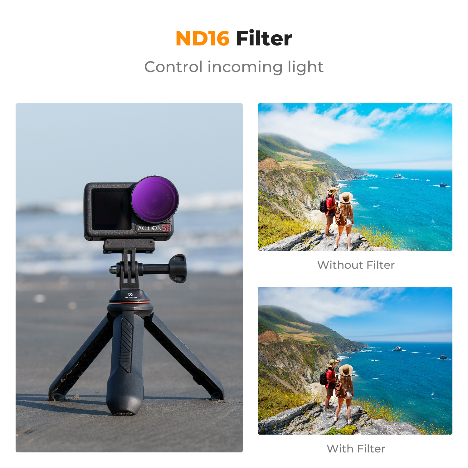 - Control preciso de la luz: el filtro ND16 reduce la luz en 4 pasos, lo que permite un control preciso de la exposición, un desenfoque de movimiento más fluido y un equilibrio de luces incluso en condiciones de exterior muy luminosas.