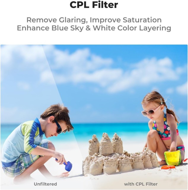 - 【Filtro híbrido ND&PL 2 en 1】Un solo filtro tiene funciones de reducción de luz y de filtro polarizador; los filtros ND16/PL, ND32/PL, ND64/PL y ND256/PL pueden utilizarse ampliamente en condiciones de luz que van de parcialmente nubladas a muy nubladas, ayudan a reducir la luz en 4, 5, 6 y 8 pasos, respectivamente, al tiempo que evitan los reflejos no deseados procedentes de materiales no metálicos, como el agua, el cristal, etc., y contribuyen a aumentar el contraste y la intensidad del azul del cielo y el blanco de las nubes.