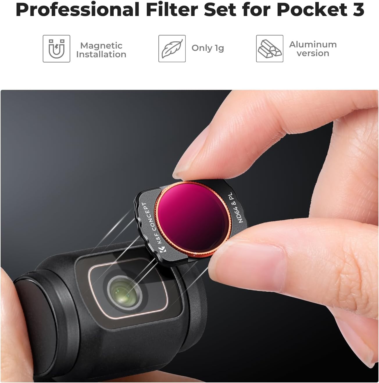 - 【Kit de 6 filtros para Osmo Pocket 3】Este kit de 6 filtros magnéticos de K&F Concept está diseñado específicamente para la DJI Osmo Pocket 3 e incluye filtros UV, CPL, ND16/PL, ND32/PL, ND64/PL y ND256/PL; Fabricado con un marco de aleación de aluminio y un filtro óptico de cristal HD, es ligero, ultradelgado y de fijación instantánea; ayuda a mejorar los colores, reducir el deslumbramiento y controlar la luz en diferentes escenarios, por lo que es un excelente conjunto de herramientas para la grabación diaria y la creación de vlogs.
