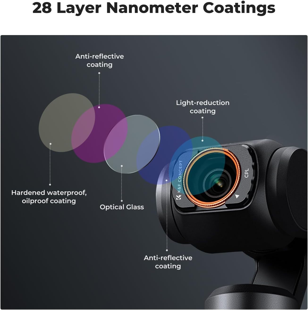 - 【28 capas de cristal óptico multicapa】 Cada filtro, fabricado con cristal óptico AGC importado, garantiza la reproducción de los colores reales de la imagen sin afectar a la calidad de la misma. Ambas caras del cristal cuentan con un tratamiento multicapa que ayuda a repeler el agua, el polvo y la grasa, y evita los arañazos. Es fácil de limpiar y mantener, y protege la lente de la Osmo Pocket 3 de los golpes cotidianos.