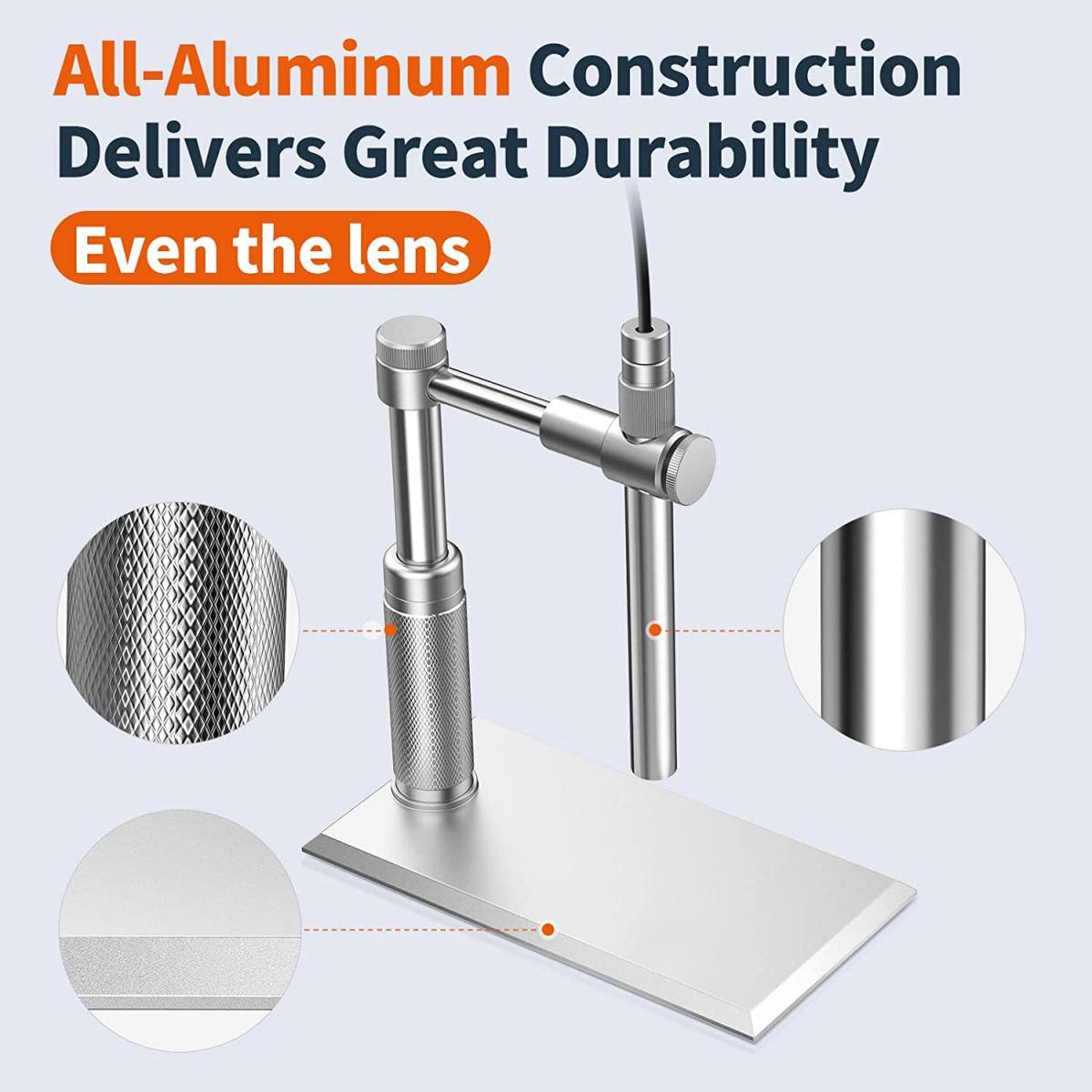 * Fabricado íntegramente en aluminio, resistente y duradero: este microscopio USB cuenta con una base, un soporte y una lente de aleación de aluminio, lo que garantiza una larga vida útil y permite realizar microsoldaduras o reparar placas de circuito impreso;