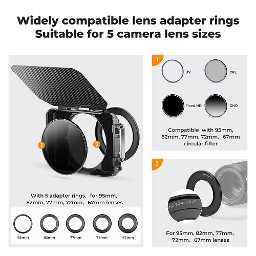 Gracias a su sistema de aletas superiores y laterales totalmente ajustables, la caja difusora ayuda a bloquear la luz no deseada, reduce los reflejos y aumenta el contraste de la imagen para obtener tomas más nítidas y con un aspecto cinematográfico. Tanto si grabas en exteriores como en estudio, este kit ofrece un rendimiento de nivel profesional en todo momento. Esta herramienta esencial está diseñada para cineastas y fotógrafos que requieren un control excelente de la luz, una protección robusta del objetivo y una gestión versátil de los filtros, lo que permite que cada toma capturada alcance un aspecto pulido y cinematográfico.