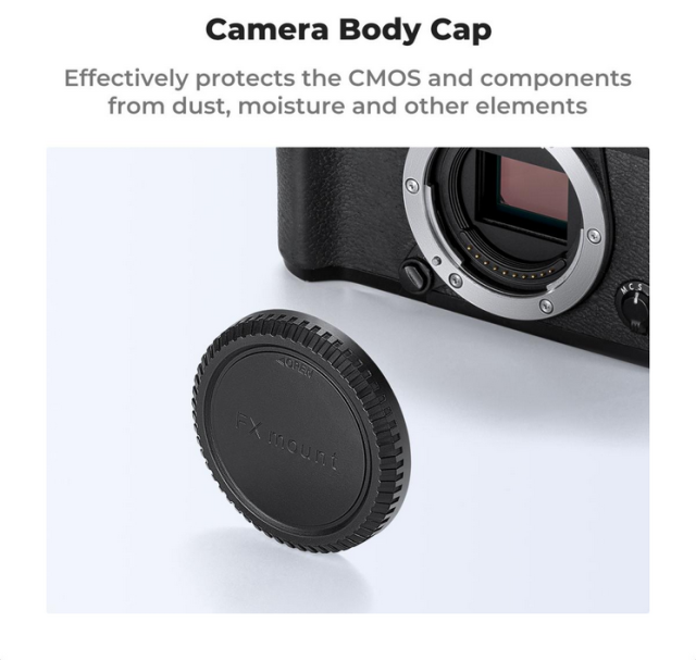 Juego de accesorios K&F para Fuji X-Mount: El juego incluye 7 piezas: tapas para el cuerpo de la cámara, tapas traseras para el objetivo, tapas para la zapata y un paño de limpieza para cámaras Fuji X-Mount.