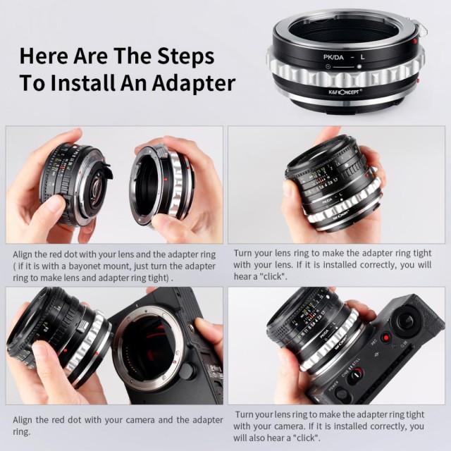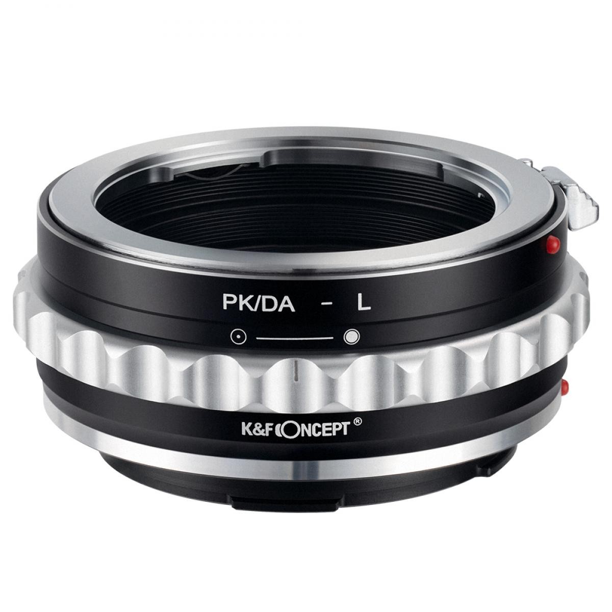 El adaptador PK/DA-L para enfoque manual es compatible con los objetivos Pentax K (PK/DA) y está diseñado para cámaras con montura L.