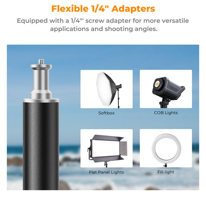 La altura del soporte se puede ajustar fácilmente entre 112 cm y 280 cm, lo que se adapta a diversos escenarios de fotografía. Soporta una capacidad de carga de 8 kg, por lo que es ideal para equipos fotográficos más pesados. Su soporte universal con rosca de 1/4" garantiza la compatibilidad con una amplia gama de dispositivos, incluyendo cámaras, flashes, luces anulares y luces de vídeo.