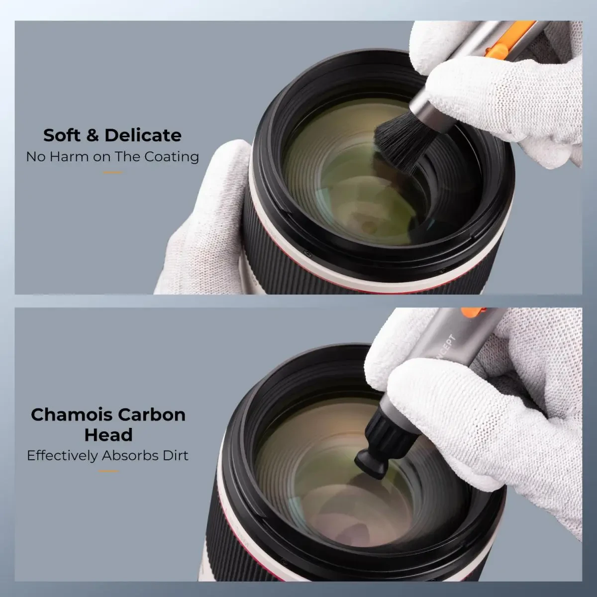 - * El cepillo es suave y delicado, no daña la superficie y limpia el polvo de la lente y las ranuras de la cámara.