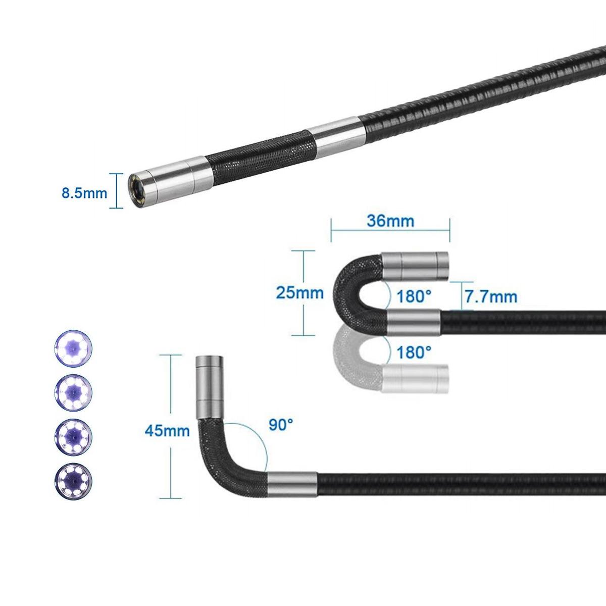 • * 【Lente orientable bidireccional de 180°】 Se dobla con facilidad y flexibilidad 180° en ambos lados, lo que permite introducir pequeñas sondas en espacios reducidos y, a continuación, transmitir a través del cable vídeos y fotografías en directo, nítidos y versátiles a las pantallas de monitores y teléfonos móviles simultáneamente. Se trata de una cámara endoscópica con luz y curvatura fija muy recomendada.