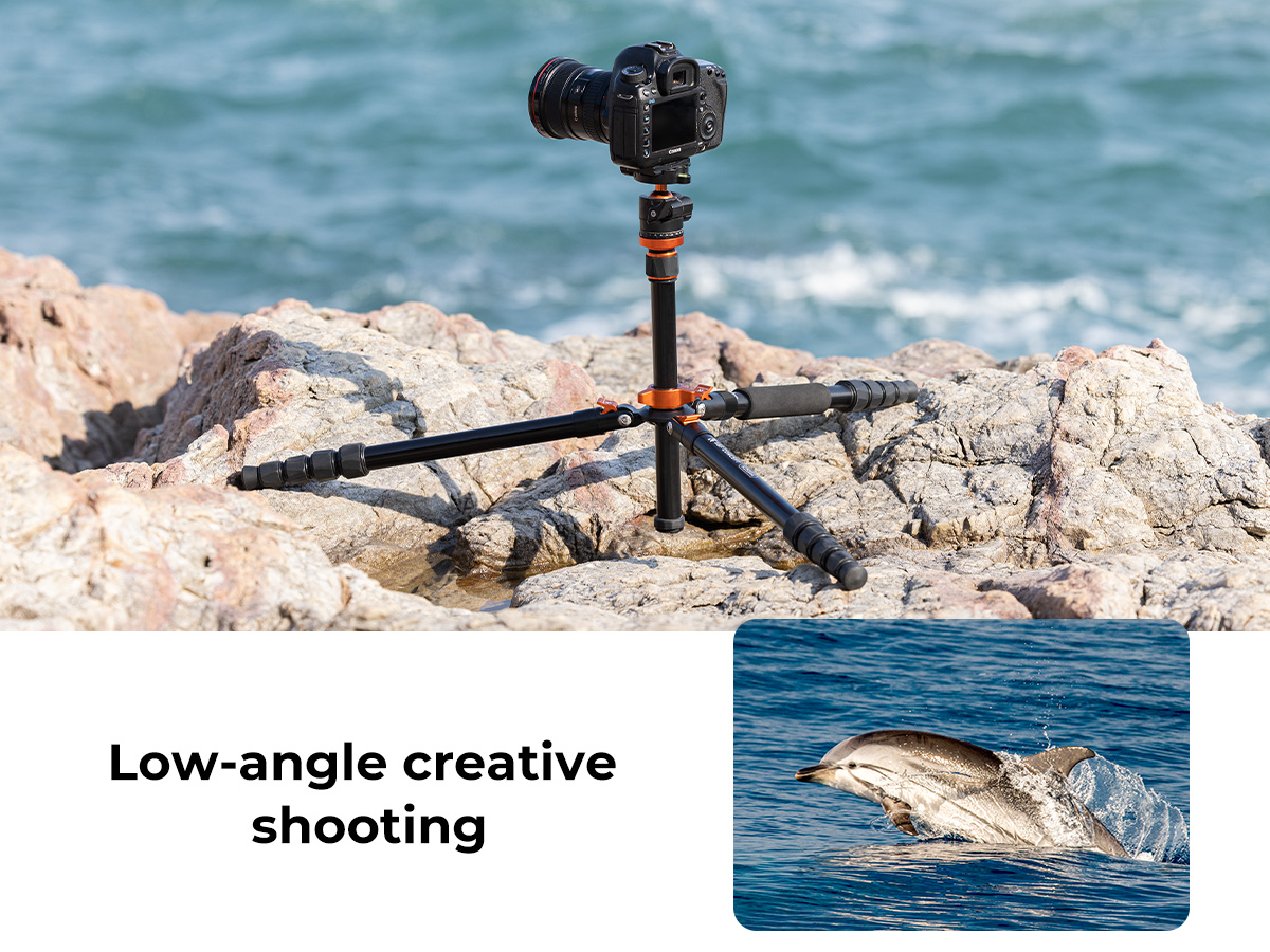 * 【TOMA MULTANGULAR】 Botón de resorte autoblocante para ajustar el ángulo del tubo de las patas; basta con pulsar y soltar para ajustar rápidamente el ángulo de apertura y cierre de las tres patas; puede ayudarte a conseguir tomas desde el ángulo más bajo, fotografías macro y otras fotos especiales mediante el eje central invertido.