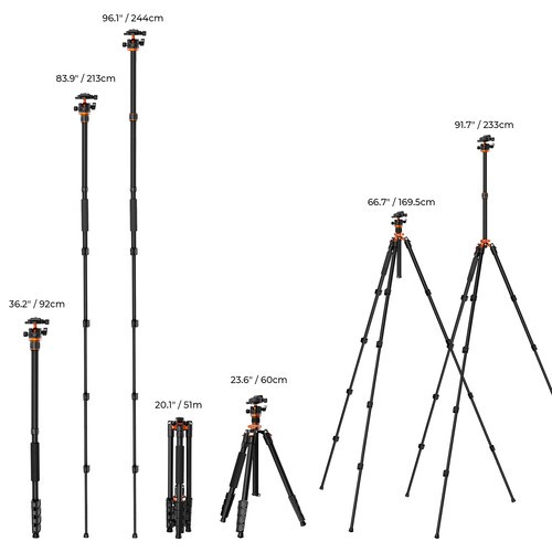 El monopié desmontable de cuatro secciones se puede acoplar a la barra central desmontable de dos secciones del trípode, lo que te ofrece un rango de altura de 60 cm a 233 cm, lo que te proporciona una versatilidad aún mayor al fotografiar sobre el terreno.