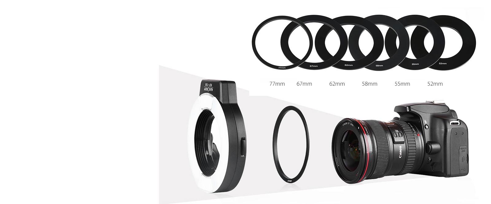 • * 【6 anillos adaptadores】 Este flash se suministra con 6 anillos adaptadores de 52, 55, 58, 62, 67 y 77 mm, compatibles con la mayoría de los tamaños de objetivos de cámara habituales. Si necesita otro tamaño, póngase en contacto con nosotros para que le ayudemos.