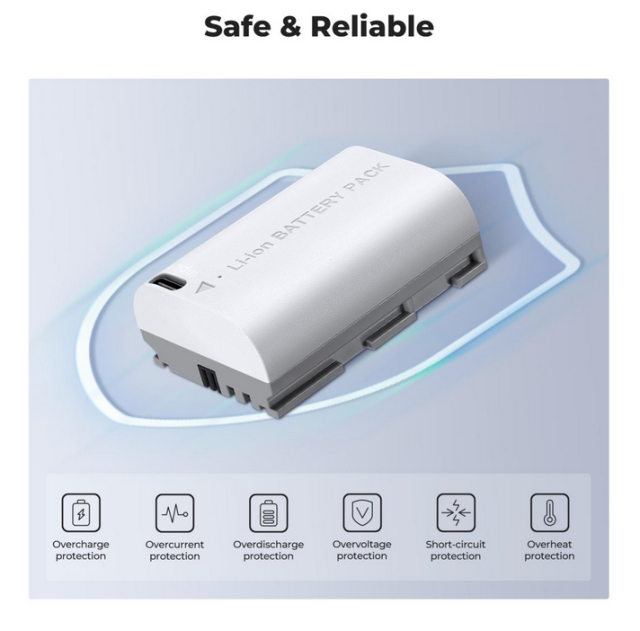 La batería K&F LP-E6NH de 2600 mAh con carga rápida tipo C para cámaras Canon está diseñada para que nada interrumpa tus sesiones fotográficas. Gracias a su alta capacidad de 2600 mAh, estas baterías te garantizan que podrás capturar hermosos paisajes sin preocupaciones. Gracias a la cómoda carga rápida tipo C, puedes conectar la batería directamente al adaptador de corriente mediante el cable incluido y cargarla por completo en aproximadamente 2 horas sin necesidad de utilizar otro cargador. Estas baterías de repuesto totalmente decodificadas son compatibles con una amplia gama de cámaras Canon, incluidos los modelos EOS 90D, 80D, 70D, 5D Mark II, III, IV, 5DS, SR, 6D, 6D Mark II, R5, R6, R6 II y R7, sin que aparezcan avisos emergentes. Entre las opciones de carga se incluyen cargadores USB de enchufe, cargadores para coche y baterías externas, que ofrecen flexibilidad y fiabilidad con seis tipos de protección: térmica, contra sobretensión, contra descarga excesiva, contra sobrecorriente, contra sobrecarga y contra cortocircuitos. Su diseño premium cuenta con un indicador de carga que se ilumina en rojo durante la carga y en verde una vez completada.