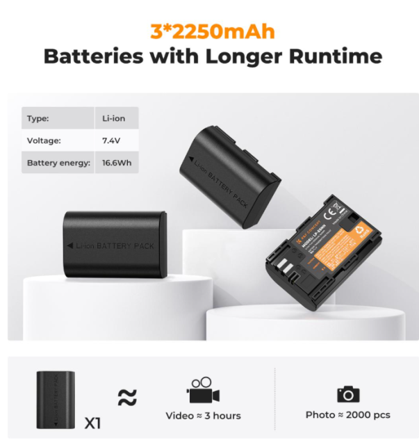 El kit incluye tres baterías de iones de litio de alta capacidad con 2250 mAh, cada una de las cuales proporciona una tensión de 7,4 V y una energía de 16,6 Wh, lo que garantiza un tiempo de disparo más prolongado y reduce la necesidad de cambiar las baterías con frecuencia durante sesiones fotográficas largas. Estas baterías están diseñadas como un sustituto fiable de los modelos LP-E6, LP-E6N y LP-E6NH.