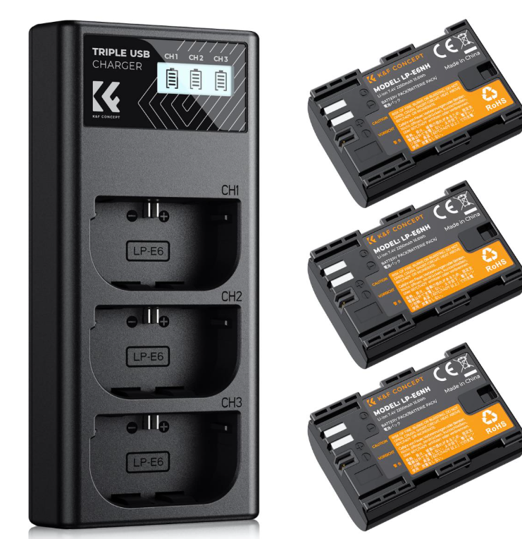 El kit de baterías LP-E6/LP-E6NH KF28.0039V1 y cargador de tres ranuras constituye una solución de alimentación universal diseñada para cámaras Canon, como los modelos Canon EOS R5, Canon EOS R6 y otros modelos compatibles con las baterías LP-E6. Incluye tres baterías de alta capacidad de 2250 mAh y un cargador LCD inteligente con tres ranuras para una carga simultánea eficaz.