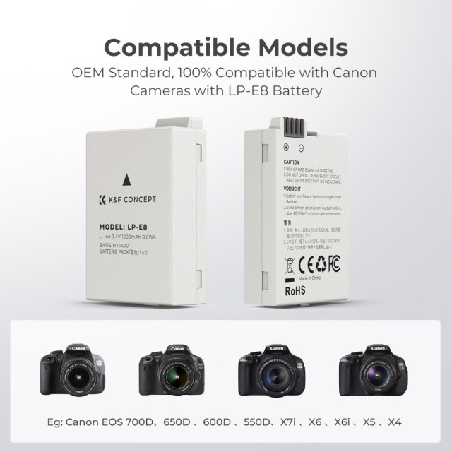 - * 【Compatibilidad estándar】 Compatibilidad total con cámaras que utilizan baterías del modelo LP-E8; admite cargadores originales, como los de las Canon EOS 700D, 650D, 550D, X7i, X6i, X5 y otras cámaras