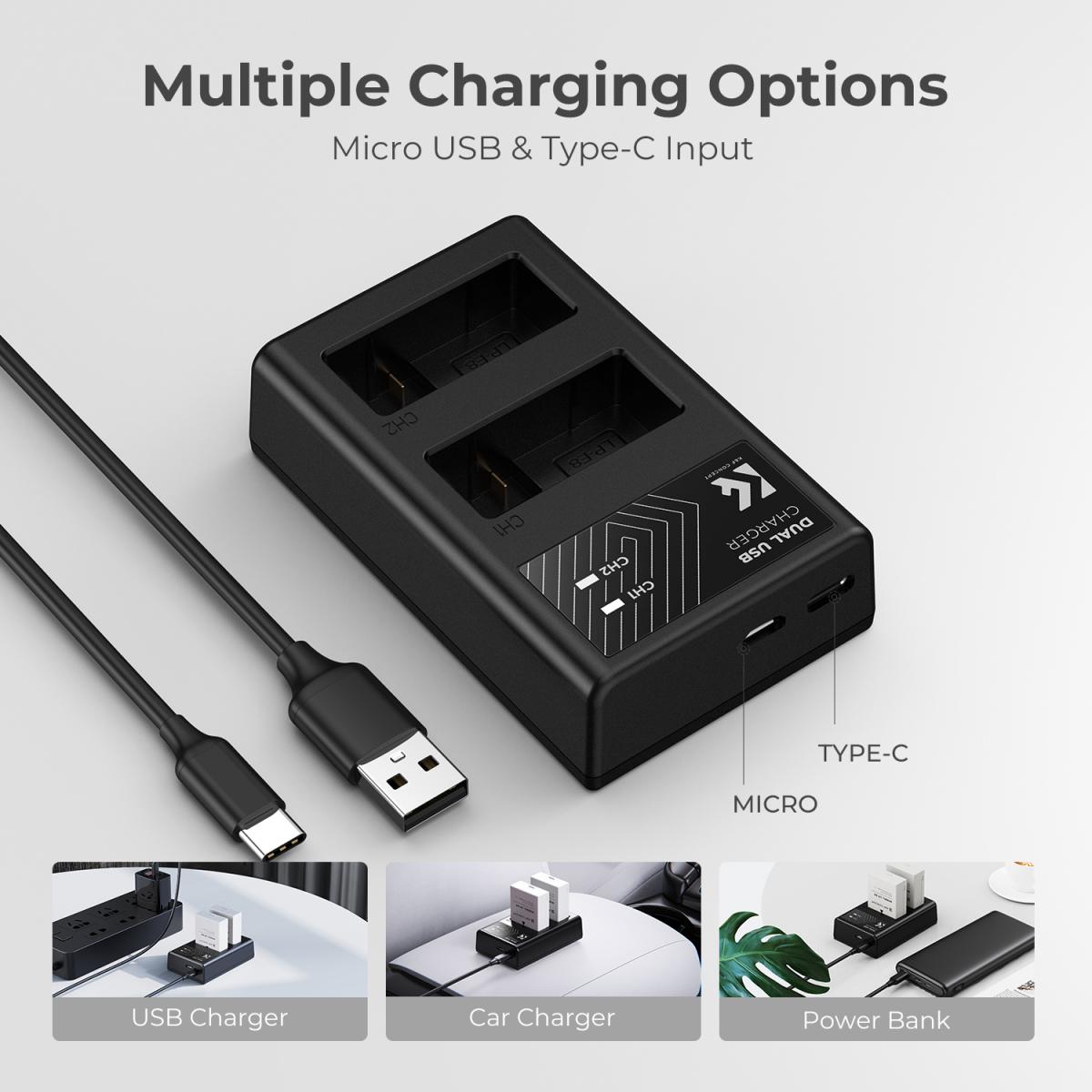 Dos baterías de repuesto LP-E8 con una capacidad de 1200 mAh y un cargador de dos ranuras proporcionan más energía para fotografiar. Totalmente compatible con las cámaras que utilizan baterías del modelo LP-E8, admite cargadores originales, como los de las Canon EOS 700D, 650D, 550D, X7i, X6i, X5 y otras cámaras. El cargador cuenta con dos interfaces de entrada, Micro USB/Tipo C, y admite diversas opciones de carga: se puede cargar mediante una fuente de alimentación portátil, una batería externa, un cargador USB y un cargador para coche; le ofrece diversas opciones de carga, al igual que un cargador estándar.