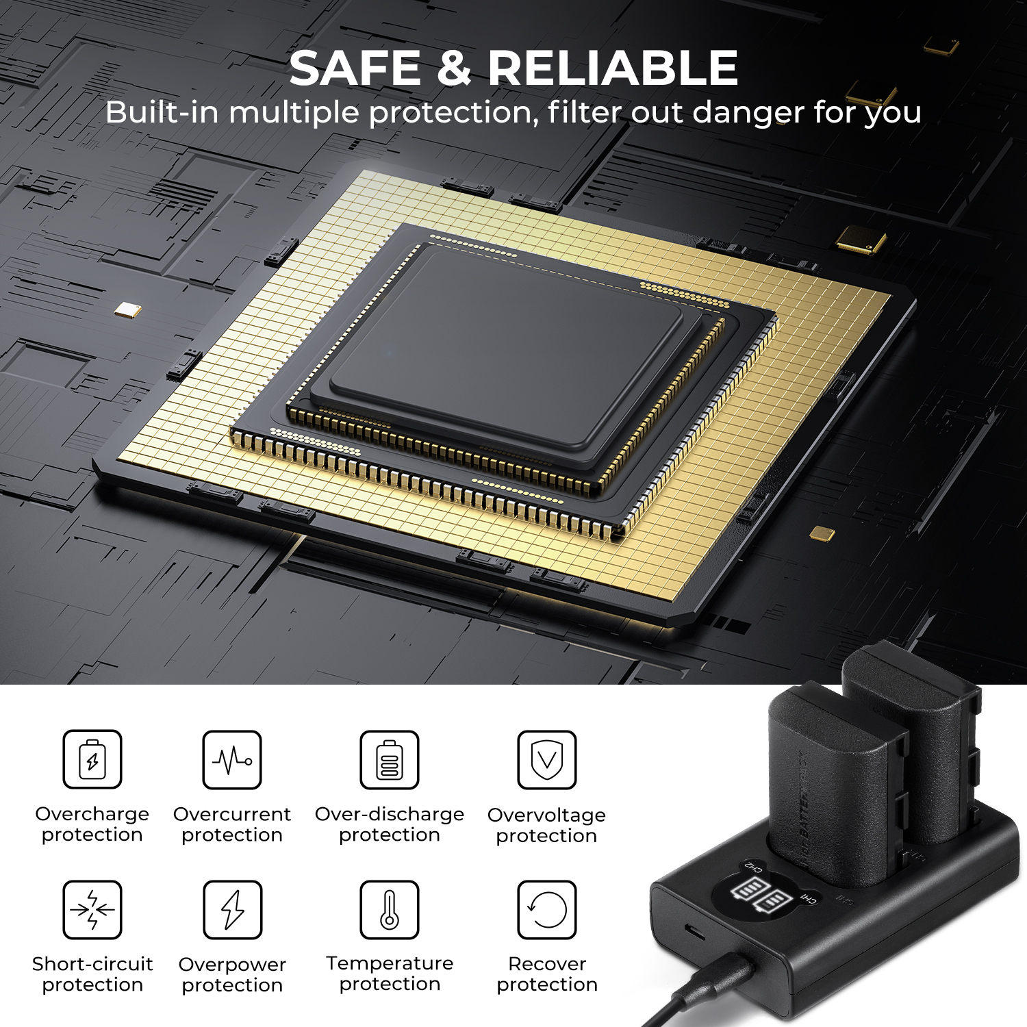 * 【Seguridad】 Utiliza baterías de alta calidad, cumple con estrictas normas de control, es seguro y fiable, lo que garantiza una carga y un uso seguros, con múltiples circuitos de protección que evitan la sobrecarga de la batería, protección contra sobrecorriente, protección contra descarga excesiva, protección contra sobretensión, protección contra cortocircuitos, protección contra sobrealimentación, protección contra altas temperaturas y protección contra la reactivación. - Tiempo de carga completa de dos baterías a la vez: aprox. 5,5 h - Temperatura de funcionamiento: menos de 60 °C.