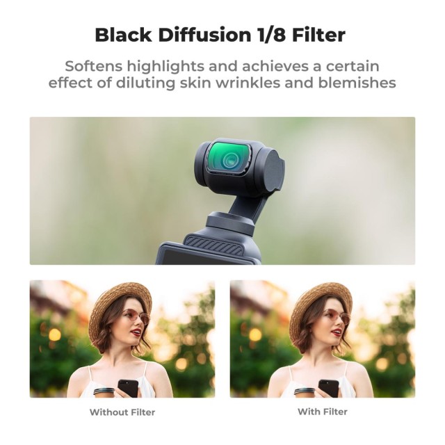 - 【Filtro difusor negro 1/8 para Osmo Pocket 3】Este filtro difusor negro de 1/8 ayuda a reducir suavemente los reflejos y el deslumbramiento, a disminuir el contraste y a conseguir un efecto cinematográfico más suave y onírico.