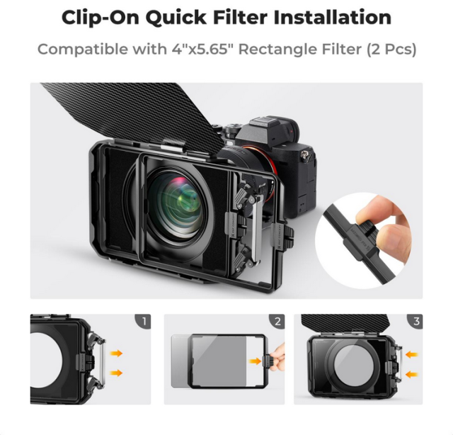 • Sistema de filtros versátil y seguro: La caja mate tiene capacidad para dos filtros de 4x5,65" (4 mm de grosor) y está equipada con un mecanismo de bloqueo seguro que mantiene los filtros en su sitio. Esta flexibilidad se adapta a las diferentes necesidades fotográficas en diversos entornos.