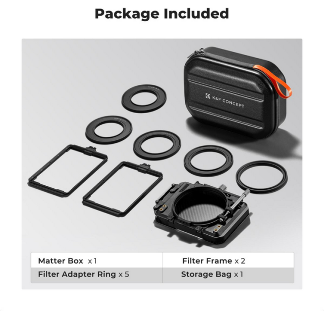 K&F Matte box kit:5pcs Adapter Rings(67/72/77/82/95mm)+2 pcs of 4*5.65 inch filter frame+Large Capac