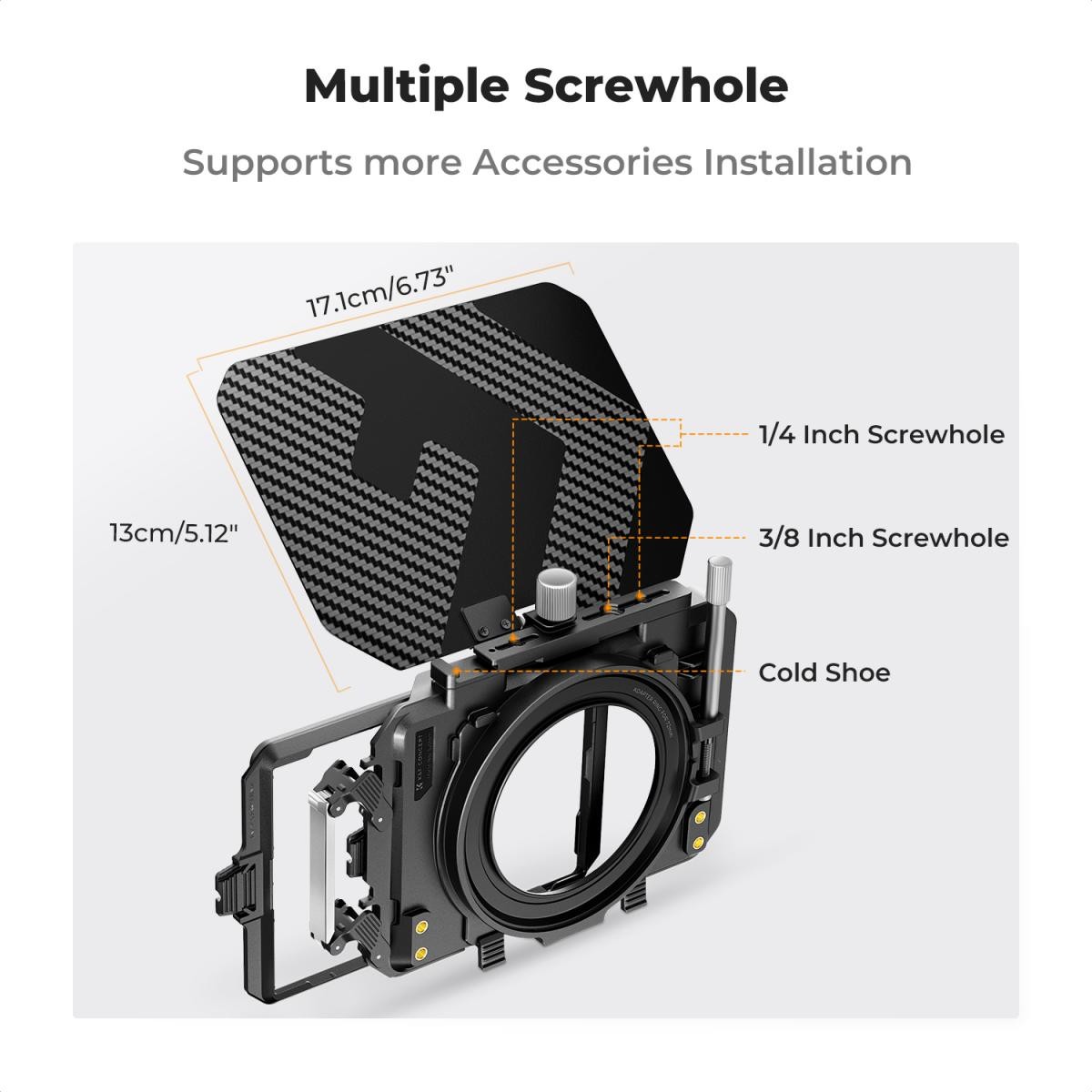 - * 【Compatibilidad completa】Incluye 5 anillos adaptadores (67/72/77/82/95 mm) que se adaptan a la mayoría de objetivos de cámaras DSLR y sin espejo. También incluye varios puertos de expansión (1/4", 3/8", zapata fría) para instalar accesorios adicionales y mejorar aún más la experiencia fotográfica.
