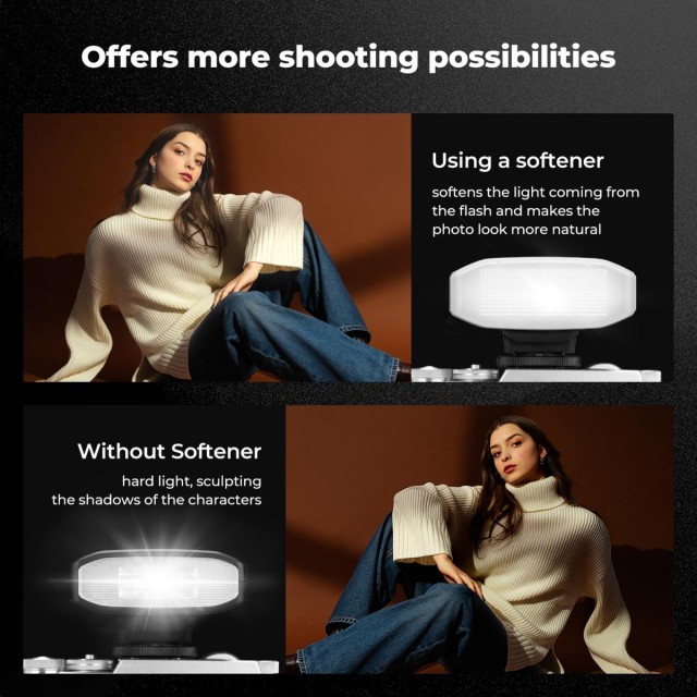 • * 【Zapata estándar de un solo punto】 El miniflash KF-M01 es compatible con las principales marcas de cámaras, incluyendo Canon, Sony, Nikon, Panasonic, Olympus, Pentax y cámaras digitales. Nota: No es compatible con Sony ZV-1F, Canon EOS Rebel SL3/250D, T7/1500D/2000D ni T100/3000D/4000D/200DII. Comprueba tu dispositivo antes de comprar.