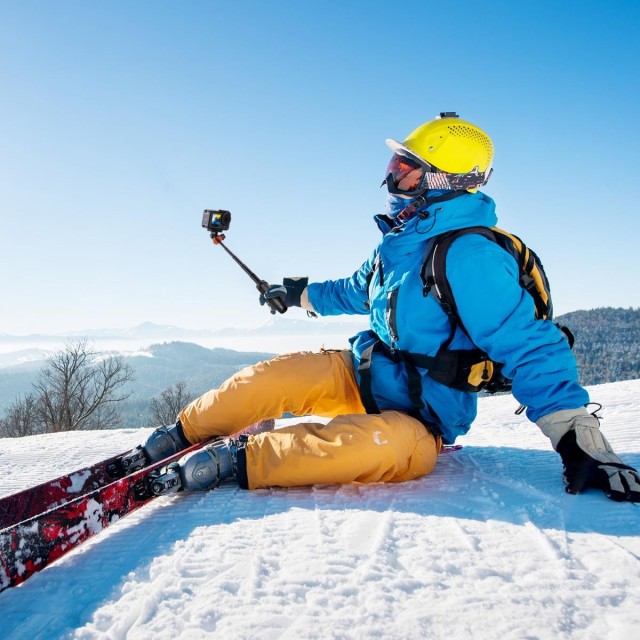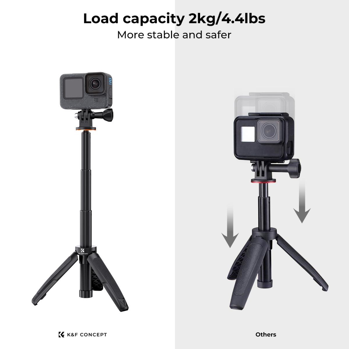 Soportes para cámaras de acción. Soporte de mesa para palo selfie (tamaño pequeño) para GoPro, Action y Insta, en negro y naranja. Este pequeño trípode para teléfono cuenta con una estructura rígida reforzada y silicona antideslizante. El tubo ajustado incorpora un anillo de goma amortiguador, lo que hace que todo el tubo extendido sea más estable y resistente. Base en la parte inferior para un apoyo más estable.